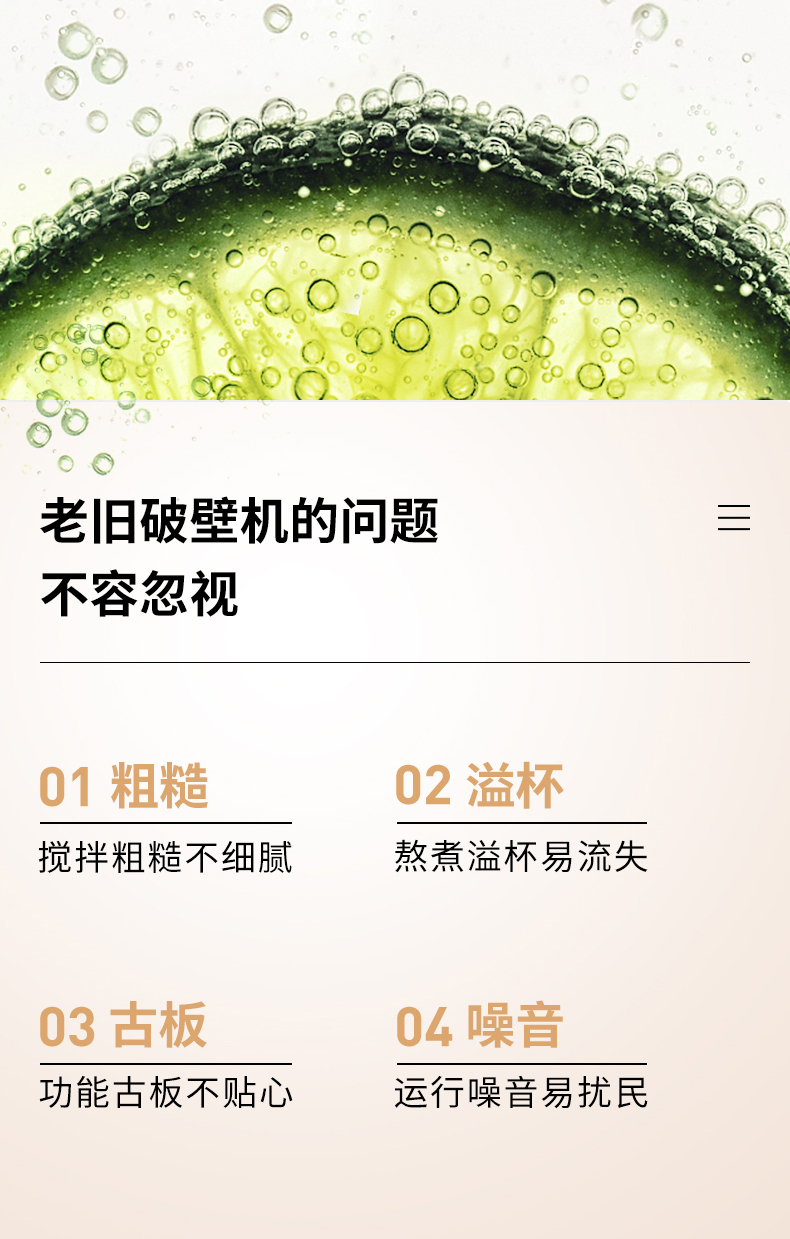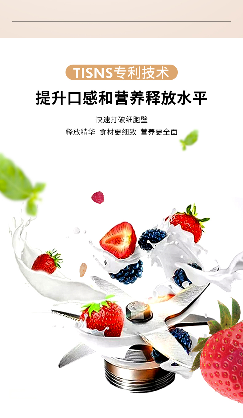 1、大扰流筋杯体设计;2、一体刀组发热盘;3、分离电机控制系统;4、预约定时功能;5、一键保温;6、TISNS增香提鲜专利