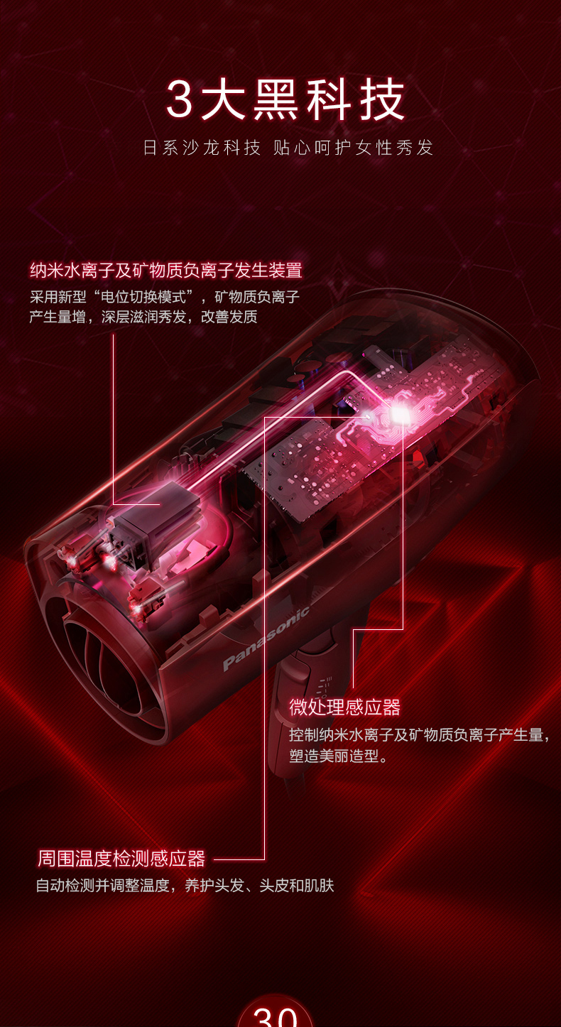 1:搭载纳米水离子及矿物质负离子发生装置;2:搭载智能控温装置;3:8种智能模式:服帖模式、蓬松模式、智能冷热交替模式、冷风模式、头皮模式、发梢模式、肌肤模式